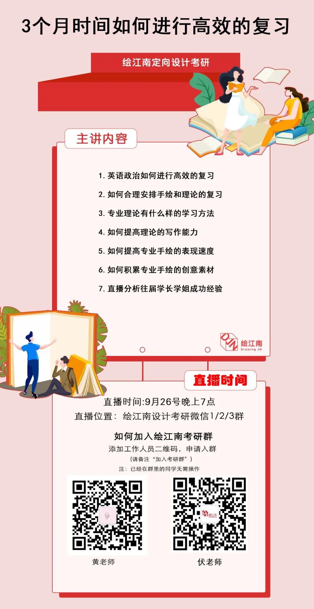 手绘是分值很高的一门,考研手绘的模板的制作的时间是在绘江南的国庆和十一月份,这个阶段更加针对学校考试的风格和应试的内容准备模板,其次就是按照课程安排完成好每个小阶段的学习任务和作业,同时,注意练习过程中的元素积累和版式构图,对于前期积累的元素和颜色就会是很好的素材,需要将自己的练习作品与考试风格和要求结合,进行创作成完整的画面,画到一定数量之后可以根据自身的情况进行模板制作,来达到完整的画面效果。由于东师去年的手绘考试题目有所变动,新增了一门设计基础,主要考试内容为构成,所以这门科目也是要投入心力去准备的,这个的完成效果绘江南的老师有为大家找到了相关的效果图,所以还是很明确的,相对来说更容易去朝着这个方向努力。其次就是总结积累,自己的构图、版式、色彩存在着哪些问题,之前画的作品哪些可以元素替换,哪些可以放到一个大的主题,都是可以为后面更好的学习做积累。十月以后,四门课程的内容都需要学习,手绘又是需要较长时间准备的,所以合理安排好时间就很重要。每周最好还是按照要求完成一到两张是比较好的,然后就是发现问题总结问题,平常也可以多去相关的网站看看积累一些好的素材。